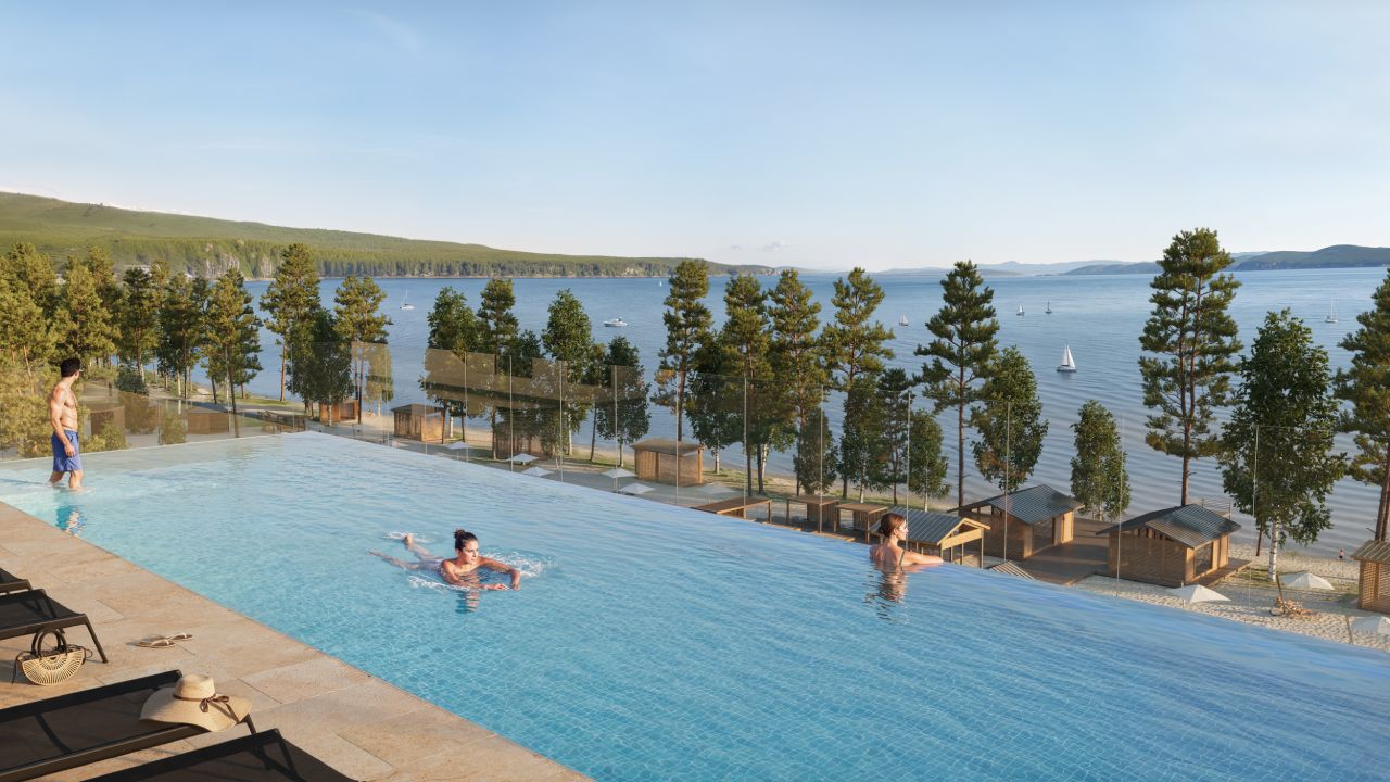 Масштабный проект термального комплекса Баден-Баден с большим открытым бассейном на улице, крытым бассейном, инфинити бассейном на крыше одного из корпусов с потрясающим видом на озеро и горы. Открытый бассейн с pool-баром прямо на пляже.